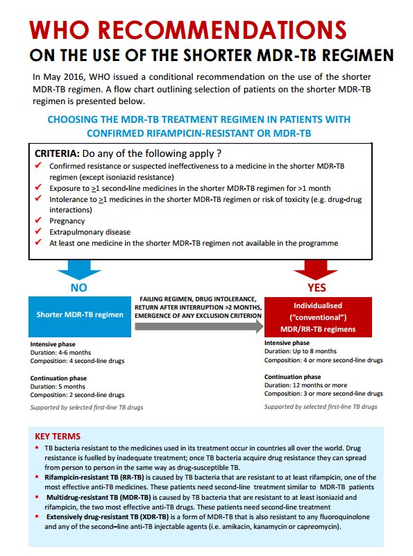 Regimen pendek direkomendasikan untuk pasien yang didiagnosis dengan MDR-TB rumit, misalnya orang-orang yang MDR-TB tidak resisten terhadap obat yang paling penting yang digunakan untuk mengobati MDR-TB (fluoroquinolones dan injeksi), yang dikenal sebagai “obat lini kedua” . Hal ini juga dianjurkan untuk individu yang belum diobati dengan obat lini kedua.