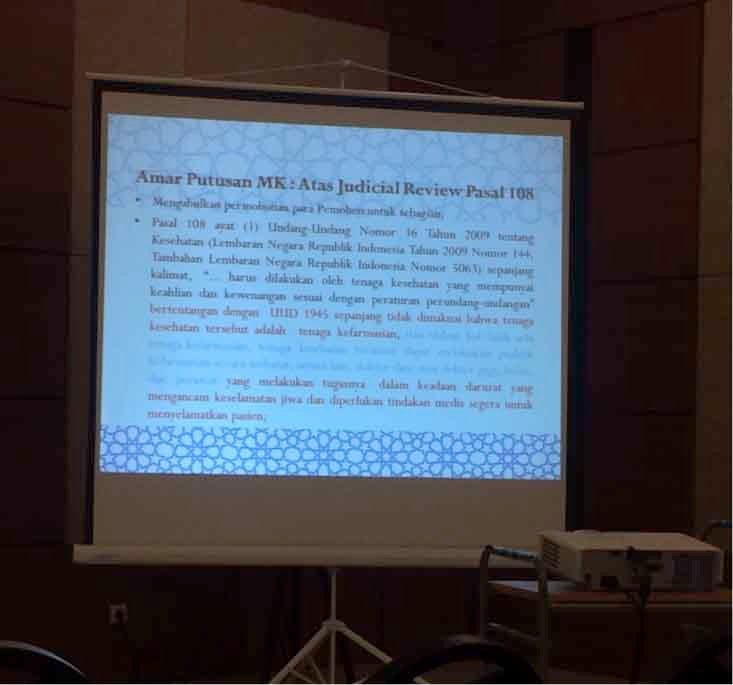 Kemudian beliau memaparkan Amar putusan MK atas judicial review pasal 108 hasil rancangan bersama dengan rekan tenaga kesehatan lainnya seperti dokter dan perawat, dimana obat diberikan oleh Apoteker. Adapun dapat diberikan oleh tenaga kesehatan lainnya seperti dokter, perawat, dan dokter gigi jika pasien ada dalam keadaan sangat darurat. Karena sebetulnya menerima pelayanan dari Apoteker langsung adalah merupakan hak setiap pasien yang perlu dipertanggungjawabkan.