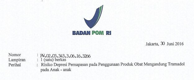 Majalah Farmasetika (V1N5-Juli 2016). Badan Pengawas Obat dan Makanan (BPOM) pada 30 Juni 2016 mengeluarkan “Safety Alert” untuk produk yang mengandung tramadol pada anak karena telah ditemukan kasus internasional yang menyebabkan risiko depresi pernapasan.