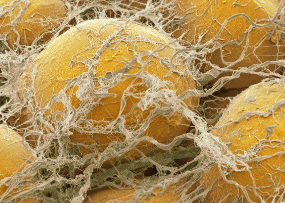 Sel-sel lemak yang dikelilingi oleh jaringan ikat, terlihat pada perbesaran ribuan kali dari ukuran mereka sebenarnya. Setiap sel lemak mengandung lipid tunggal, atau tetesan minyak. (Science Photo Library)
