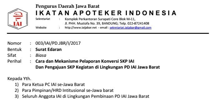 “Surat ini kami buat untuk memberikan apresiasi dan memastikan nilai SKP atas seminar atau kegiatan-kegiatan yang telah diikuti anggota, namun belum memiliki bobot SKP IAI” kata Ali Mashuda, S.Si, MM., Apt. Ketua PD IAI Jabar dihubungi melalui ponsel (26/1/2017).