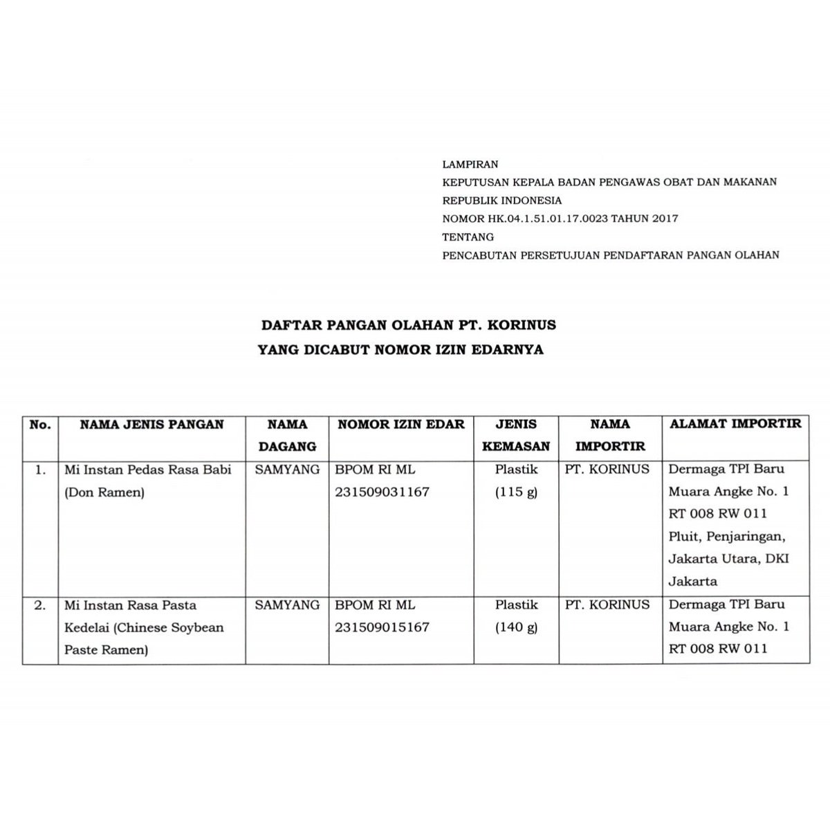 Badan POM mengeluarkan surat keputusan HK.04.1.51.01.17.0023 terkait Pencabutan Persetujuan Produk Pangan Olahan Mi Samyang.