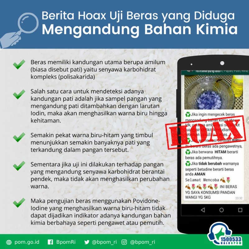 Sumber : http://www.pom.go.id/new/view/more/klarifikasi/53/PENJELASAN-BADAN-POM-TERKAIT-PEMBERITAAN-UJI-BERAS-YANG-DIDUGA-MENGANDUNG-BAHAN-KIMIA-MENGGUNAKAN-POVIDONE-IODINE.html