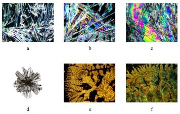 Gambar 1. Kristal vitamin B1 (a), Kristal vitamin B6 (b, c), dan krital vitamin C (d, e, f).