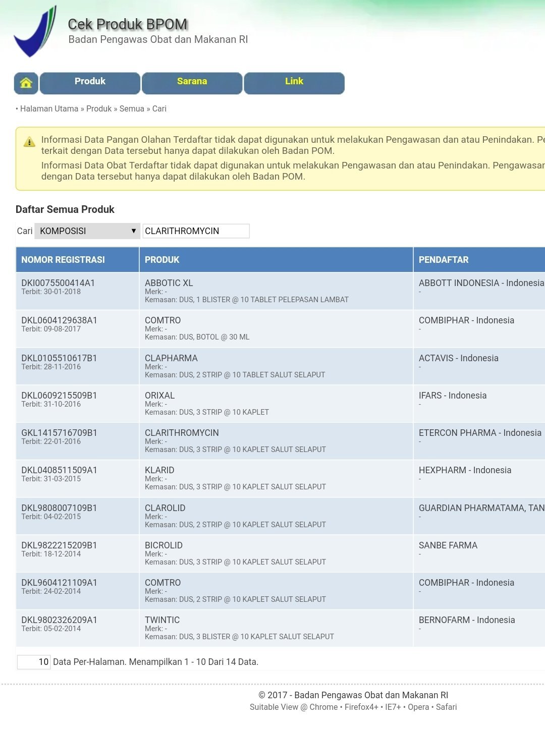 - http://cekbpom.pom.go.id/index.php/home/produk/75594ec9f730d6a07ffdef75724fb396/all/row/10/page/1/order/4/DESC/search/5/CLARITHROMYCIN