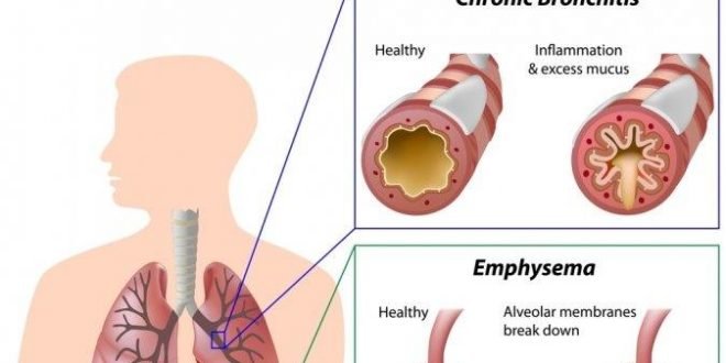 Bronkitis kronis didefinisikan secara klinis sebagai adanya batuk kronis selama 3 bulan selama masing-masing 2 tahun berturut-turut. Emfisema didefinisikan secara patologis sebagai pembesaran permanen dan tidak normal pada ruang udara di bagian distal bronkiolus terminal, disertai dengan penghancuran dinding alveoli (Mosenifar, et al., 2018).