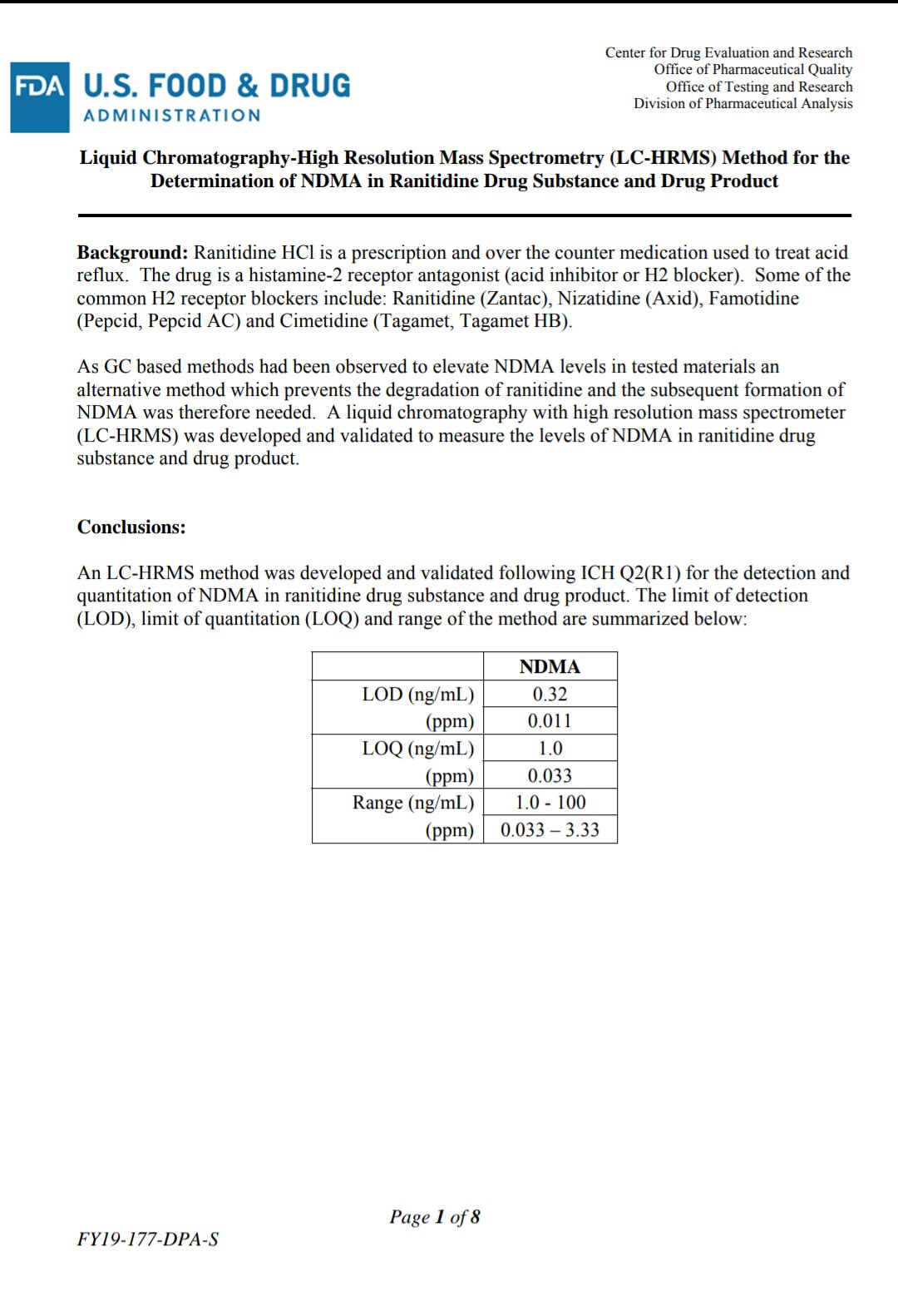 Sesuai dengan laporan yang dilansir oleh US-FDA, metode ini mampu mendeteksi NDMA dalam obat Ranitidine dengan kadar yang sangat kecil. Dari hasil Validasi Metode Analisis Penetapan Kadar NDMA dalam obat Ranitidine, ditemukan bahwa :