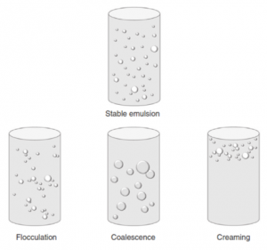 Ketika suatu emulsi menjadi tidak stabil, hal yang kemungkinan terjadi adalah pembentuk flokulasi, koalesen atau creaming. Flokulasi dapat terjadi jika globul fase terdispersi bergabung menjadi agregat yang lebih besar. Koalesen adalah lanjutan ketidakstabilan dari flokulasi dimana agregat yang berkumpul semakin banyak dan membesar. Sedangkan creaming adalah terbentuk beberapa lapisan yang dapat terlihat secara langsung, biasanya fase air dan minyak berpisah namun tidak menunjukkan batas pemisahan yang jelas dan tampak seperti gradient.