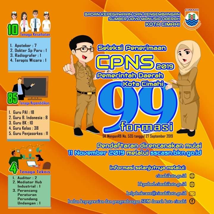 Pendaftaran CPNS direncanakan mulai 11 November 2019 melalui sscasn.bkd.go.id. Keterangan lengkap bisa melihat situs resmi Pemkot Cimahi.