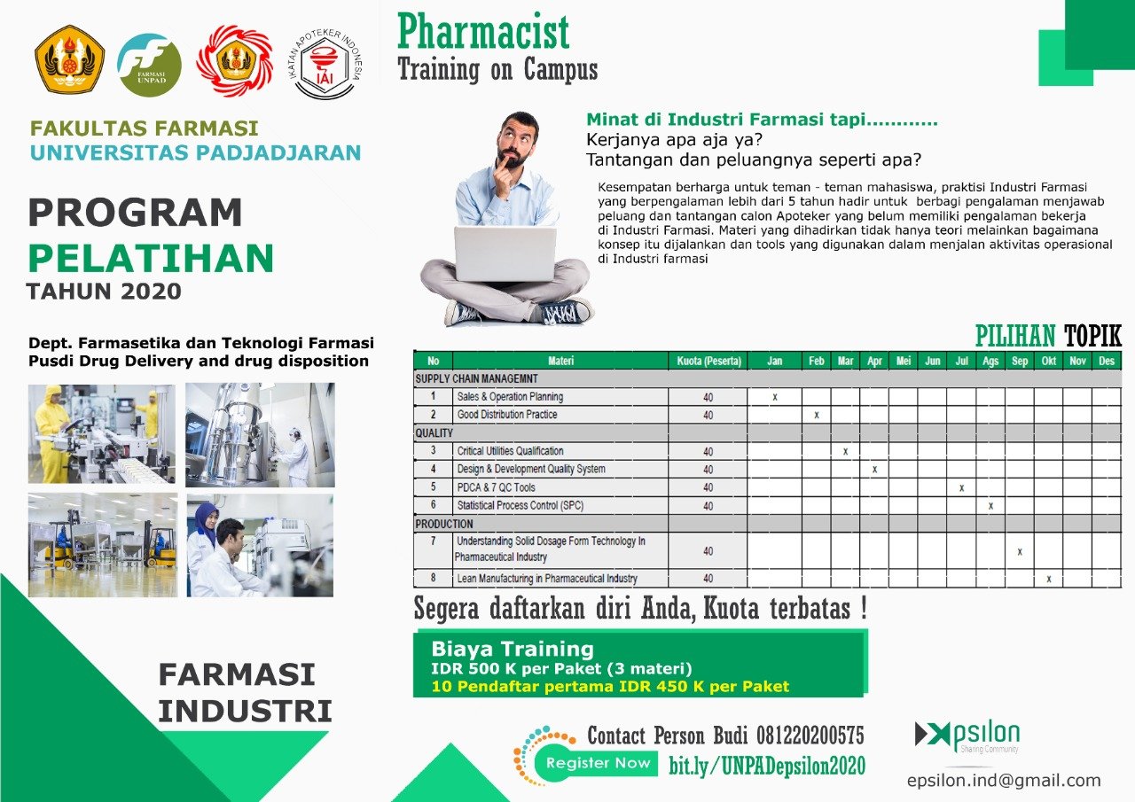 Farmasetika.com – Epsilon Sharing Community bekerja sama dengan Departemen Farmasetika dan Teknologi Farmasi (FTF), Fakultas Farmasi Universitas Padjadjaran mengadakan “On-Campus Pharmaceutical Industry Training”, yaitu pelatihan bagi Apoteker maupun calon Apoteker agar siap dalam melakukan praktik kefarmasian di industri farmasi.
