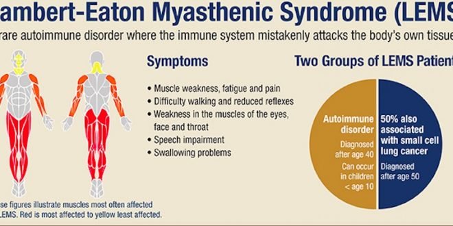 farmasetika.com – Lambert ‐ Eaton myasthenia (LEM) adalah kelainan autoimun langka yang sering dikaitkan dengan keganasan, biasanya kanker paru-paru sel kecil (Juel, 2015). Studi epidemiologis menunjukkan bahwa sekarang mungkin ada sekitar 800 pasien dengan LEM di AS dan hingga 170 kasus baru setiap tahunnya (Abenroth DC et al., 2017).