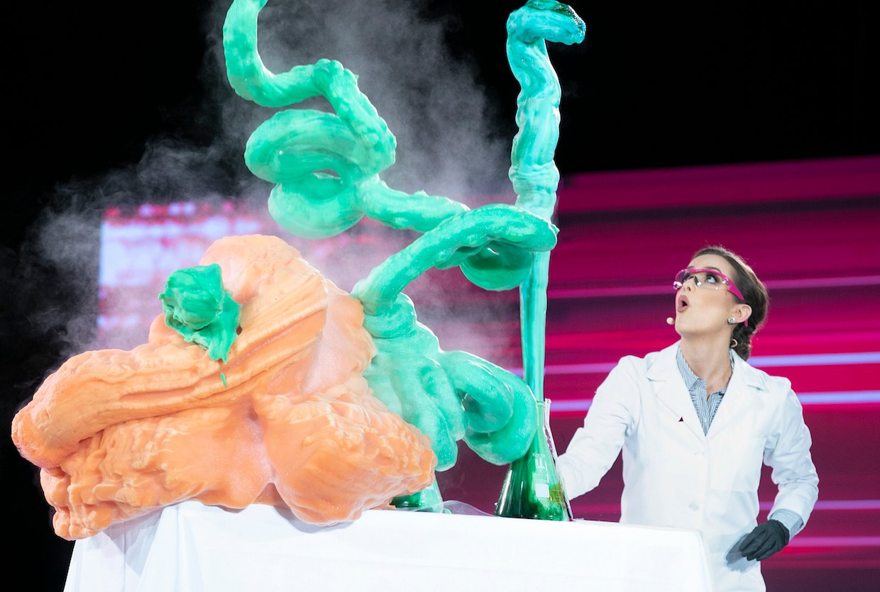 Setelah mencari online untuk percobaan sains untuk anak-anak, ia menemukan sebuah eksperimen yang kadang-kadang disebut “pasta gigi gajah” yang menunjukkan penguraian cepat hidrogen peroksida menggunakan kalium iodida sebagai katalis. Hasilnya adalah ledakan busa yang dramatis.