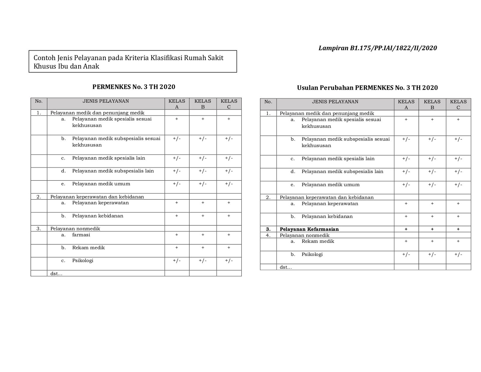 | (terlampir) | Lampiran di seluruh klasifikasi rumah sakit ditambah item baru pada jenis pelayanan, yaitu “Pelayanan Kefarmasian” yang terletak setelah item “Pelayanan Keperawatan dan Kebidanan”.