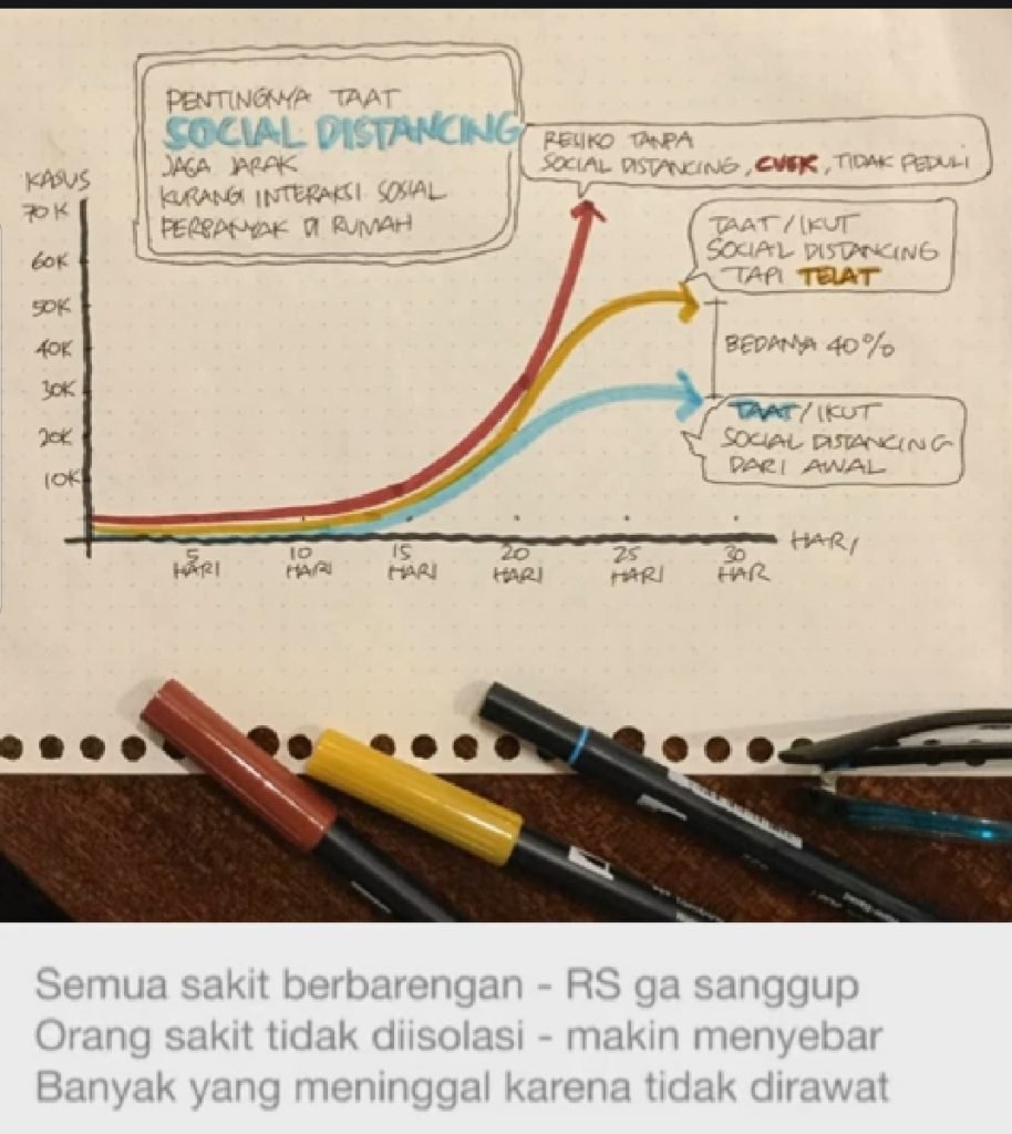 “Jika kita taat, disiplin dan mau kurangi interaksi sosial di awal 14 hari ini atau melakukan Social Distancing seperti di gambar warna biru maka penyebaran bisa jauh berkurang dan bisa dikontrol dengan baik.” Lanjutnya.