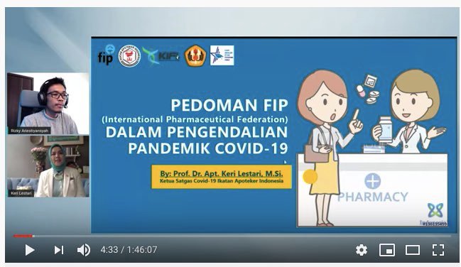 Peserta yang mengikuti webinar ini tercatat sekitar 200 peserta. Prof. Keri yang juga sebagai Ketua Satgas COVID-19 Ikatan Apoteker Indonesia membagi Pedoman FIP untuk Apoteker dalam Pengendalian Covid-19 menjadi 10 bagian.