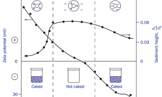 Permasalahan caking mulai dipelajari sekitar 50 tahun yang lalu oleh Haines dan Martin. Seperti terlihat pada gambar di bawah ini, mereka mempelajari suspensi bismuth dan sulfamerazin dimana penurunan potensial zeta dengan melakukan penambahan fosfat pada suspensi bismut subnitrat dan ion aluminium sulfamerazin ternyata menurunkan insidensi caking. Hasil tersebut akhirnya masuk pada kesimpulan bahwa gaya elektrostatik repulsif diketahui dapat mencegah koagulasi koloid [1,2]. Dengan demikian, potensial zeta mempengaruhi terjadinya caking pada suspensi.