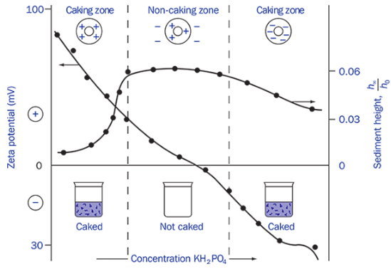 Permasalahan caking mulai dipelajari sekitar 50 tahun yang lalu oleh Haines dan Martin. Seperti terlihat pada gambar di bawah ini, mereka mempelajari suspensi bismuth dan sulfamerazin dimana penurunan potensial zeta dengan melakukan penambahan fosfat pada suspensi bismut subnitrat dan ion aluminium sulfamerazin ternyata menurunkan insidensi caking. Hasil tersebut akhirnya masuk pada kesimpulan bahwa gaya elektrostatik repulsif diketahui dapat mencegah koagulasi koloid [1,2]. Dengan demikian, potensial zeta mempengaruhi terjadinya caking pada suspensi.