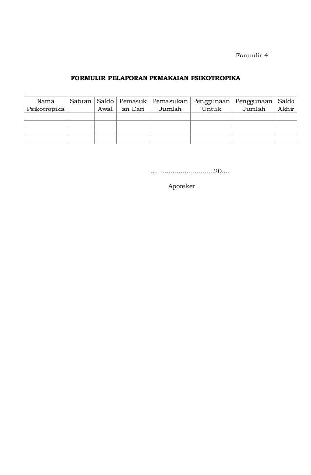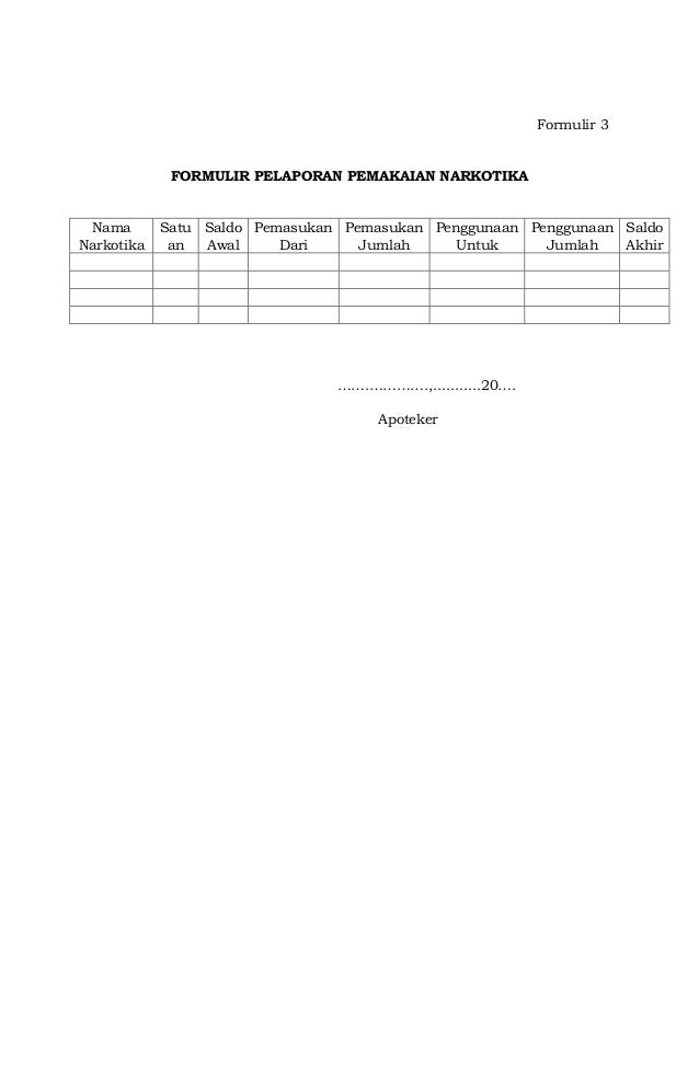 Pelaporan narkotik, psikotropika dan prekursor farmasi dalam bentuk obat jadi dilaporkan ke Dinas Kesehatan Kota/Provinsi dengan tembusan Balai POM. Pelaporan dilakukan paling lambat tanggal 10 bulan berikutnya.