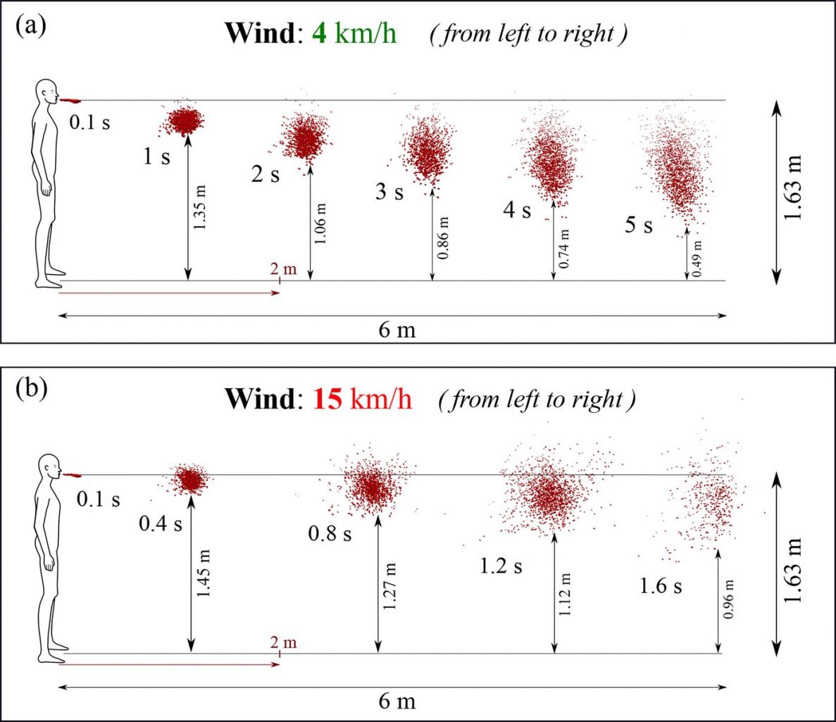 Dalam sebuah penelitian yang diterbitkan 19 Mei 2020 di jurnal Physics of Fluids, peneliti Talib Dbouk dan Dimitris Drikakis dengan Lembaga Riset Pertahanan dan Keamanan di Universitas Nicosia di Yunani berpendapat bahwa dengan angin sepoi-sepoi – hanya 2,5 mph – hanya butuh 5 detik bagi tetesan kecil itu untuk menempuh jarak 18 kaki atau sekitar 5 meter lebih.