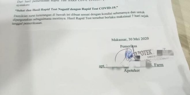 Surat yang berjudul “Surat Keterangan Rapid Tes COVID-19” menjelaskan kepada salah satu pasien tercantum keterangan “Sehat dengan Hasil Rapid Test Negatif dengan Rapid Test COVID-19”. Dalam surat tersebut tertera menggunakan alat rapid test yang digunakan pada 30 Mei 2020 dengan ditandatangani tertulis oleh apt. Nur Annisa Muthia Muis dan cap apotek.