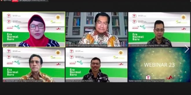 Hal ini disampaikan oleh Ketua PP IAI, Drs. apt. Nurul Falah Eddy Pariang, dalam diskusi panel webinar ke 23 dengan topik “Bersiap Menuju Era New Normal” yang diselenggarakan oleh PT ISFI Penerbitan, 9 Juni 2020.