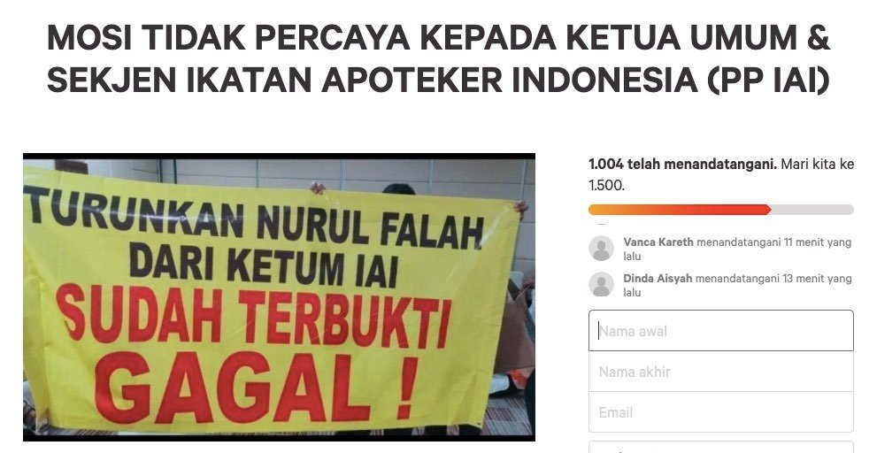 “Setelah mengikuti dinamika organisasi Ikatan Apoteker Indonesia sejak 2018 sampai dengan hari ini. Kami menilai bahwa pelayanan, kinerja dan pengelolaan organisasi yang dilakukan PP IAI banyak melanggar norma hukum dan peraturan yang berlaku.” tertulis dalam petisinya.