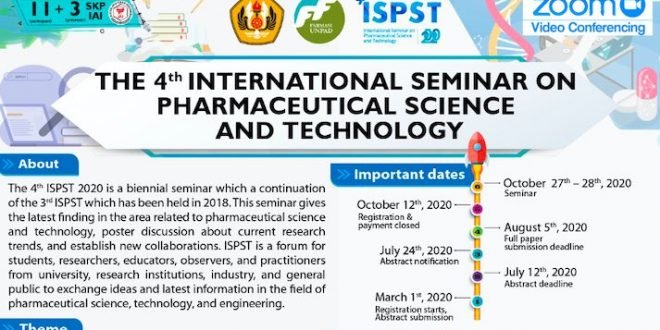 Majalah Farmasetika – Untuk pertama kalinya setelah digelar rutin 2 tahunan sejak 2014, The 4th International Seminar on Pharmaceutical Science and Technology (ISPST), dengan total 14 SKP Ikatan Apoteker Indonesia (IAI), yang sediakalanya akan diselenggarakan di salah satu Hotel di Bandung pada 27-28 Oktober 2020 diputuskan digelar dengan konsep Zoom Video Conferencing untuk seminar 1000 peserta, dan pesentasi ilmiah secara paralel dengan Google Meet.