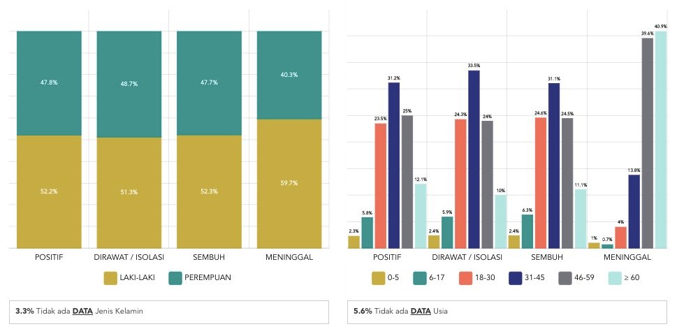 Data kematian pasien COVID-19 di situs resmi Gugus Tugas Percepatan Penanganan COVID-19, menunjukan jumlah prosentase kematian pasien COVID-19 usia diatas 46 tahun masih menjadi yang tertinggi. Namun, semua umur menujukan bisa terinfeksi, dan data kesembuhan sebanding dengan jumlah positif pada usia dibawah 46 tahun.