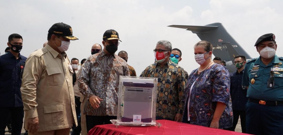 Serah terima bantuan dilaksanakan secara simbolis oleh Duta Besar Amerika Serikat Heather Variava kepada Menteri Pertahanan Prabowo Subianto didampingi Sekretaris Jenderal Kementerian Kesehatan Oscar Primadi dan Gubernur DKI Jakarta Anies Baswedan di Terminal Selatan Pangkalan Udara Halim Perdana Kusuma, Jakarta (30/8).