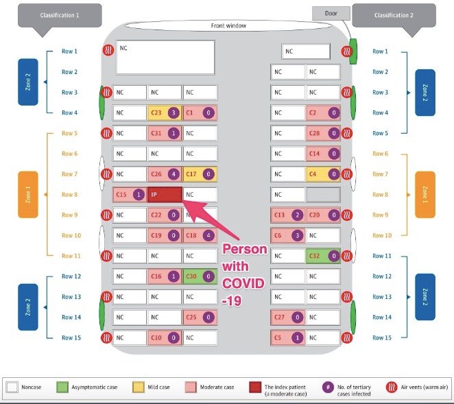 Di bus pertama, duduk di dekat orang yang terinfeksi tampaknya tidak terlalu menjadi masalah ketika harus sakit. Misalnya, orang yang duduk tepat di sebelah individu yang terinfeksi (dicatat dengan warna merah pada diagram di bawah) tidak dites positif terkena virus, tetapi beberapa orang yang duduk sejauh tujuh baris mengembangkan infeksi sedang (ditandai dengan kotak merah muda mereka. )