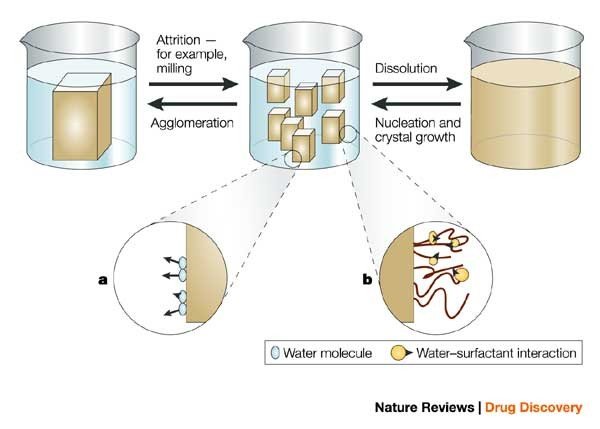 Penggilingan basah sebagai teknik manufaktur lain untuk menyiapkan nanosuspensi, bahan aktif dihancurkan dengan media penggilingan di bawah penstabil permukaan. Selain itu, obat dilarutkan dalam pelarut organik yang mudah menguap kemudian disemprotkan ke dalam larutan air yang dipanaskan, dengan adanya surfaktan, penguapan pelarut dengan cepat dan membuat pengendapan obat (Srinivasan dan Smith, 2012).