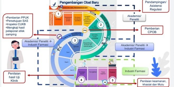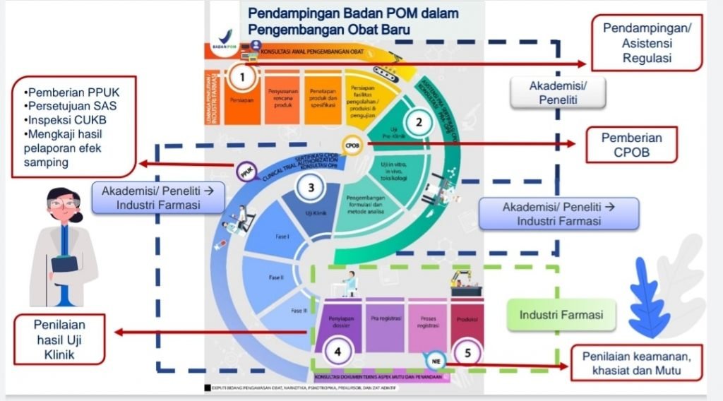 Dalam penemuan dan pengembangan obat baru BPOM melakukan pendampingan dalam setiap tahapnya seperti digambarkan berikut ini.