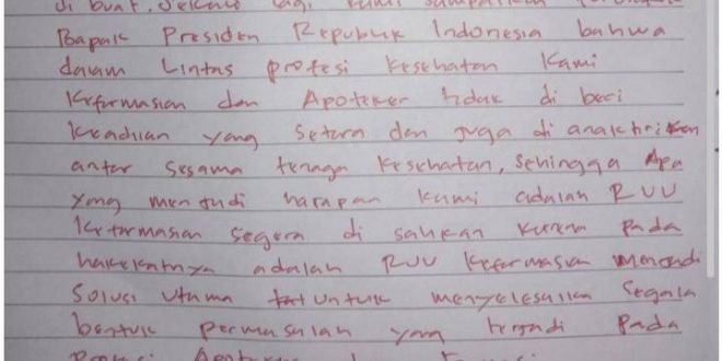 Dengan hormat saya sampaikan kepada bapak selaku pemangku kebijakan di negara ini, bahwasanya berita duka kembali kami dengar persoalan RUU Kefarmasian yang kemudian dicabut dari PROLEGNAS PRIORITAS 2021 untuk dibahas dan disahkan, kemudian lewat surat terbuka ini kami kembali menyampaikan bahwa profesi apoteker dan farmasi sedang berduka karena berbagai bentuk diskriminasi yang negara lakukan lewat regulasi-regulasi yang dibuat. Sekali lagi kami sampaikan teruntuk Bapak Presiden Republik Indonesia bahwa dalam lintas profesi kesehatan kami kefarmasian dan apoteker tidak diberi keadilan yang setara dan juga dianak-tirikan antar sesama tenaga kesehatan, sehingga apa yang menjadi harapan kami adalah RUU Kefarmasian segera disahkan karena pada hakikatnya adalah RUU Kefarmasian menjadi solusi utama untuk menyelesaikan segala bentuk permasalahan yang terjadi pada profesi apoteker dan farmasi.