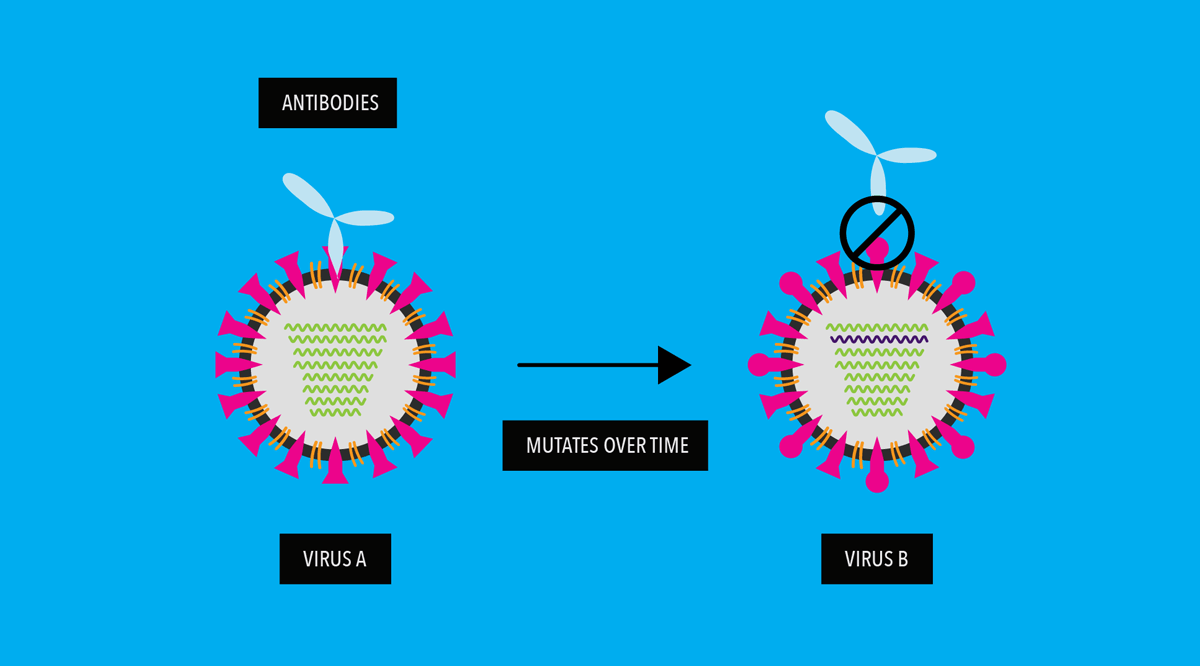 Saat virus bereplikasi, gennya mengalami “kesalahan penyalinan” acak (mis. Mutasi genetik). Seiring waktu, kesalahan penyalinan genetik ini dapat, di antara perubahan lain pada virus, menyebabkan perubahan pada protein atau antigen permukaan virus.