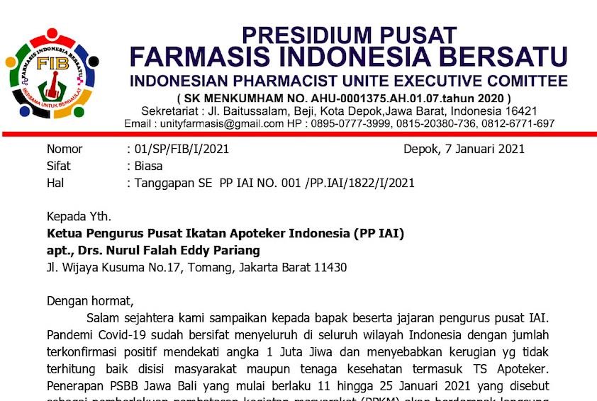 “Farmasis Indonesia Bersatu (FIB) mendesak agar Pengurus Pusat IAI (PP IAI) segera memperbaiki kembali Surat Edaran (SE) nya agar selaras dengan Surat Edaran (SE) Menteri Kesehatan. Perbaikan SE ini sekaligus untuk apresiasi atas dedikasi teman sejawat Apoteker yang tetap melakukan/melaksanakan praktek profesi ditengah ancaman pandemi Covid-19 yang tak kunjung usai.” jelas surat tanggapan FIB yang ditandatangani oleh Ketua Dewan Presidium FIB Nasional, Fidi Setiawan.