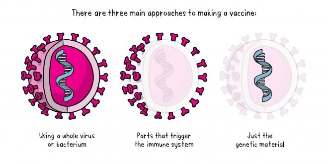Ada tiga pendekatan utama untuk merancang vaksin. Perbedaan mereka terletak pada apakah mereka menggunakan virus atau bakteri utuh; hanya bagian dari kuman yang memicu sistem kekebalan; atau hanya materi genetik yang memberikan petunjuk untuk membuat protein tertentu dan bukan keseluruhan virus.