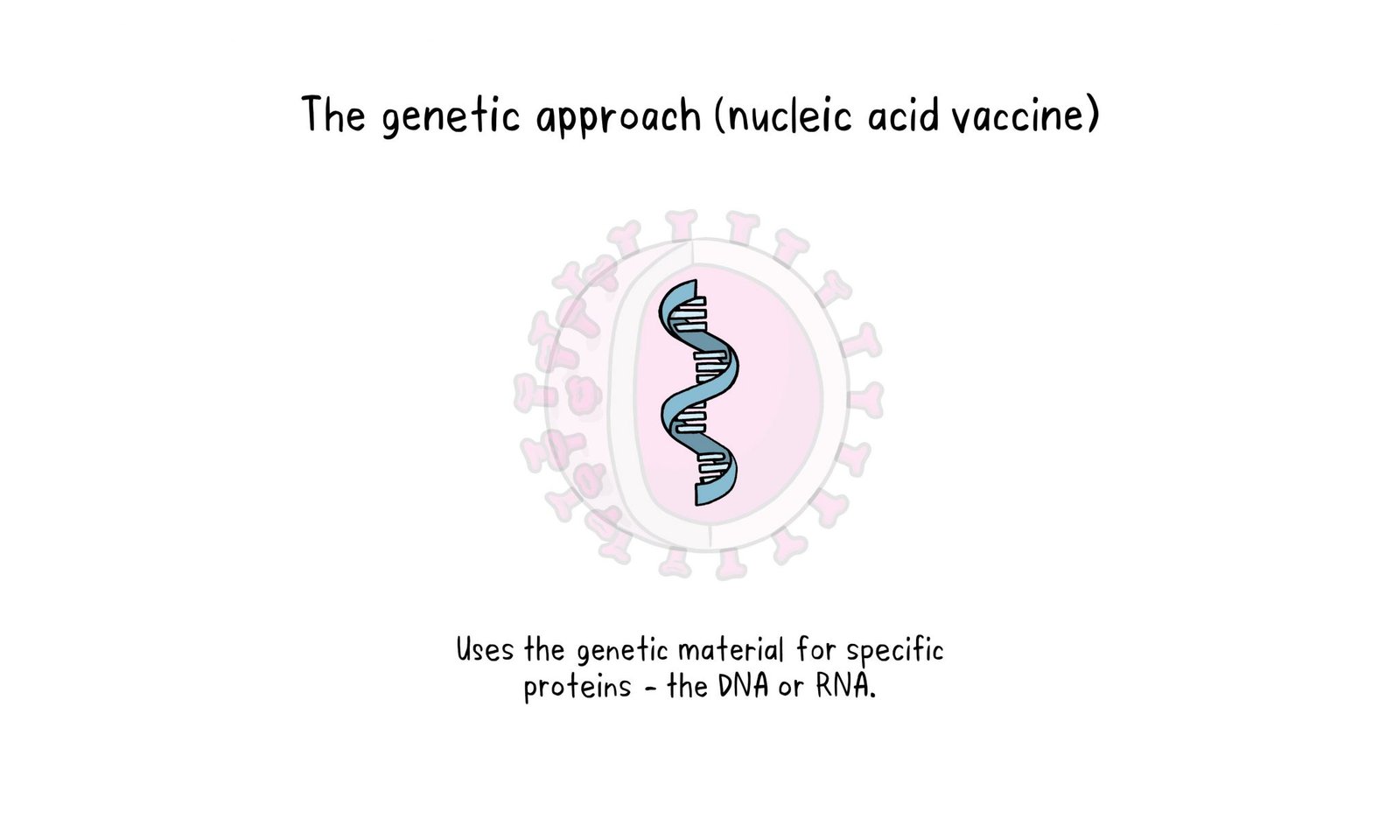 Tidak seperti pendekatan vaksin yang menggunakan mikroba utuh yang dilemahkan atau mati atau bagian dari satu mikroba, vaksin asam nukleat hanya menggunakan bagian materi genetik yang memberikan instruksi untuk protein tertentu, bukan keseluruhan mikroba.