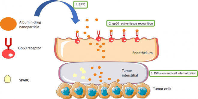 Setelah melewati lapisan endotel, obat harus melewati membran sel kanker dan masuk ke sel kanker. Setelah paclitaxel yang terikat albumin mencapai interstitium, albumin dapat mengikat glikoprotein matriks ekstraseluler yang dikenal sebagai SPARC (Secreted protein, acidic and rich in cysteine) yang juga diekspresikan secara berlebihan dalam sel kanker. Hal ini dapat memicu pelepasan paclitaxel dari albumin, memungkinkan obat bebas berdifusi ke inti sel kanker yang menyebabkan kematian sel. Penelitian menunjukkan bahwa sistem penghantaran nanopartikel memungkinkan konsentrasi obat pada kanker mencapai 10 – 100 kali lipat lebih tinggi dibandingkan ketika pemberian obat bebas.