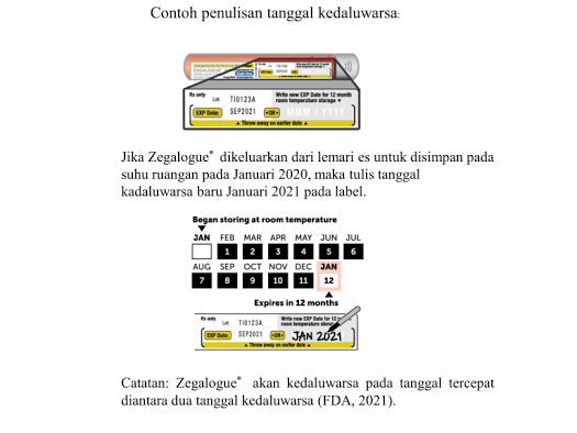 Contoh: Jika Zegalogue® tanggal kedaluwarsa yang tertulis dikemasan September 2021. Kemudian Zegalogue® dikeluarkan dari lemari es untuk disimpan pada suhu ruangan pada Januari 2020, maka tulis tanggal kedaluwarsa baru Januari 2021 pada label. Catatan: Zegalogue® akan kedaluwarsa pada tanggal tercepat diantara dua tanggal kedaluwarsa (FDA, 2021).
