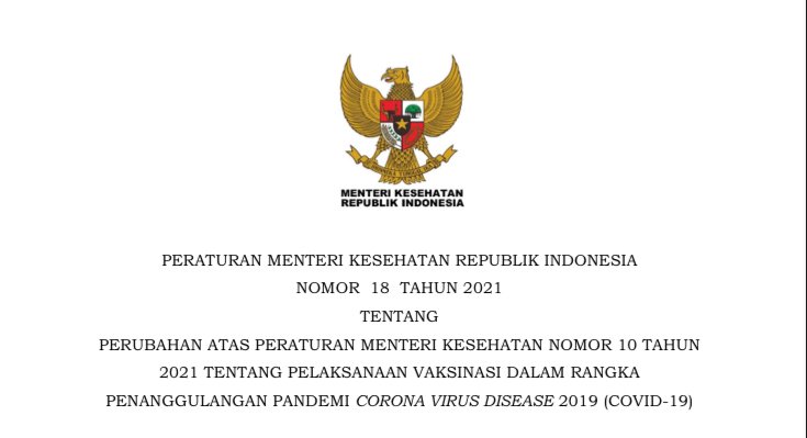 Ketentuan ini tertuang dalam Peraturan Menteri Kesehatan Nomor 18 Tahun 2021 yang disahkan oleh Menteri Kesehatan pada tanggal 28 Mei 2021, menggantikan Peraturan Menteri Kesehatan Nomor 10 Tahun 2021 dengan sejumlah perubahan menyesuaikan situasi dan kondisi saat ini.