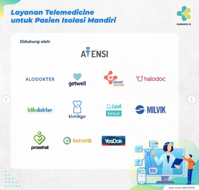 “Kita melakukan pelayanan telemedisin karena kalau sekarang harus datang ke rumah sakit, konsultasi dengan dokter, akan susah karena akan menambah risiko. Maka kita bekerja sama dengan 11 platform telemedisin untuk memberikan jasa konsultasi dokter dan juga jasa pengiriman obat secara gratis,” ujar Menteri Kesehatan (Menkes) Budi Gunadi Sadikin, dikutip dari laman resmi Kemenkes, Jumat (09/07/2021).