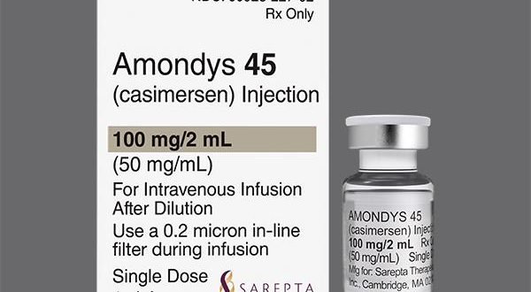 Injeksi Amondys 45 (casimersen) digunakan untuk pengobatan Duchenne muscular dystrophy (DMD) pada pasien yang terkonfirmasi memiliki mutasi gen DMD yang dapat menerima ekson 45 skipping (Exon adalah bagian dari DNA yang memberikan informasi untuk membuat protein dalam genom seseorang). FDA menyetujui Amondys 45 berdasarkan peningkatan produksi distrofin (protein yang membantu menjaga sel-sel otot tetap utuh) di otot rangka yang diamati pada pasien yang diobati dengan terapi tersebut. Hal ini merupakan pengobatan bertarget pertama yang disetujui FDA untuk pasien dengan jenis mutasi ini. Sekitar 8% pasien dengan DMD memiliki mutasi yang dapat diterima oleh ekson 45 skipping. Dosis yang direkomendasikan adalah 30 mg/kg, diberikan satu kali dalam seminggu sebagai infus intravena 35 sampai 60 menit melalui filter 0.2 mikron.