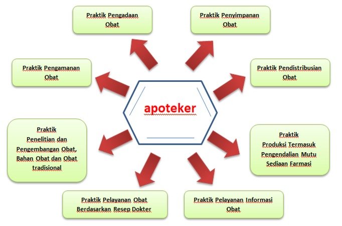 Praktik kefarmasian sebagai kewenangan yang melekat pada profesi apoteker sebagai satu-satunya tenaga professional kefarmasian, pada awalnya tertuang dalam pasal 108 ayat (1) Undang-Undang Nomor 36 Tahun 2009, namun karena adanya gugatan ke Mahkamah Konstitusi untuk permohonan Pengujian Undang-Undang Nomor 36 Tahun 2009 tentang Kesehatan terhadap Undang-Undang Dasar Negara Republik Indonesia Tahun 1945, maka berdasarkan Putusan Mahkamah Konstitusi Republik Indonesia Nomor 12/PUU-VIII/2010, definisi Praktik kefarmasiaan meliputi pembuatan termasuk pengendalian mutu sediaan farmasi, pengamanan, pengadaan, penyimpanan dan pendistribusian obat, pelayanan obat atas resep dokter, pelayanan informasi obat serta pengembangan obat, bahan obat dan obat tradisional harus dilakukan oleh tenaga kefarmasian dan dalam hal tidak ada tenaga kefarmasian, tenaga kesehatan tertentu dapat melakukan praktik kefarmasian secara terbatas, antaralain, dokter dan/atau dokter gigi, bidan, dan perawat yang melakukan tugasnya dalam keadaan darurat yang mengancam keselamatan jiwa dan diperlukan tindakan medis segera untuk menyelamatkan pasien. Dari definisi ini, maka sesungguhnya kewenangan apoteker dalam menjalankan praktek profesinya secara garis besar, yang terdiri atas: