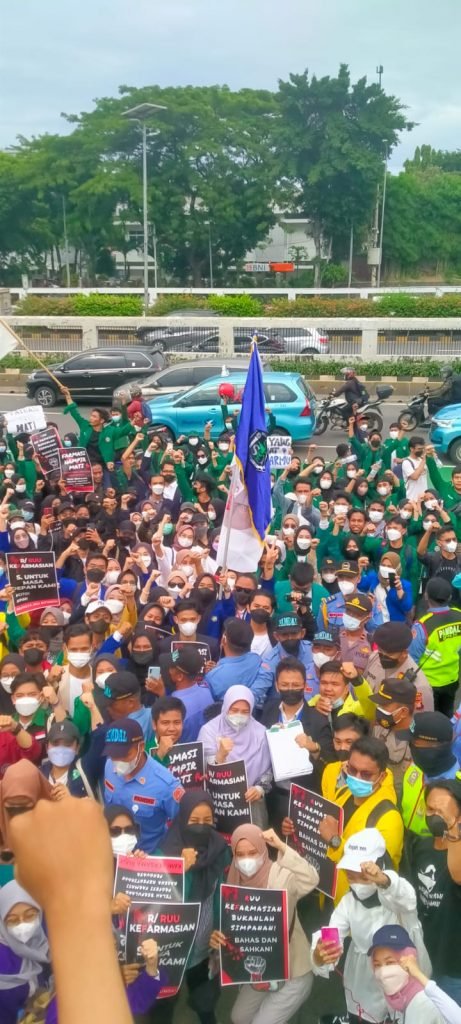 Majalah Farmasetika – Sekitar 450 mahasiswa Farmasi dari berbagai Kota di Indonesia melakukan aksi di depan Gedung DPR RI menyuarakan disahkannya Rancangan Undang-Undang (RUU) Kefarmasian (19/11/2021).