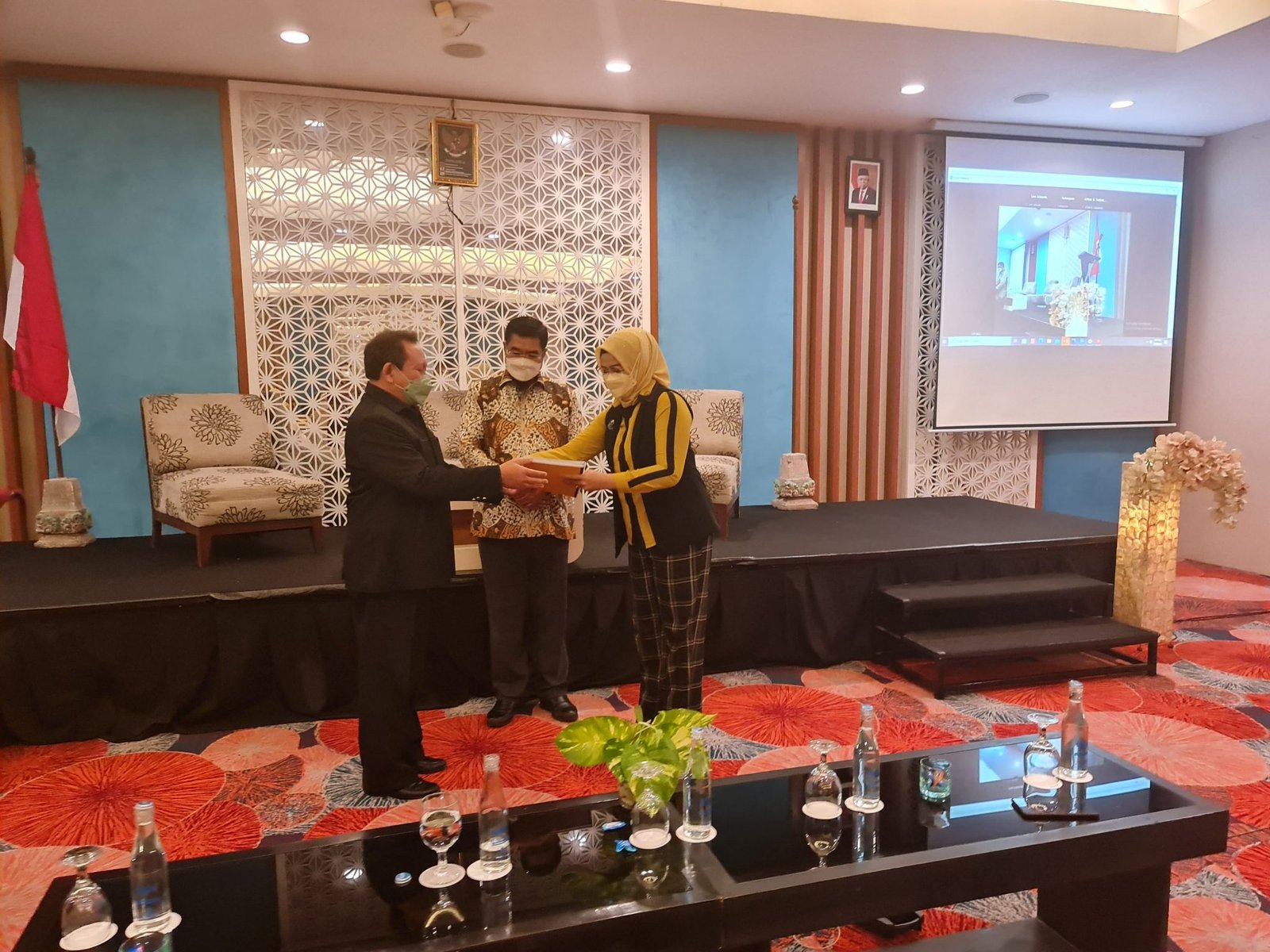 Penyerahan naskah akademik diberikan oleh perwakilan HISFARSI, apt Raka, kepada ketua KIFI, Prof. apt. Keri Lestari, disaksikan oleh Ketua Umum Pengurus Ikatan Apoteker Indonesia (PP IAI), apt Nurul Falah Eddy Pariang.
