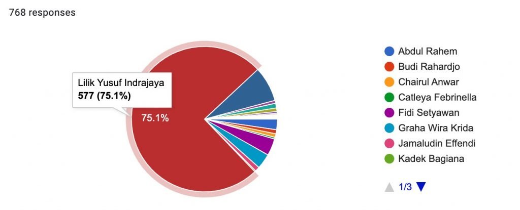 Sebanyak 577 (75,1%) responden memilih Lilik Yusuf Indrajaya, diikuti oleh Mufti Djusnis 60 (7.8%) responden, dan Fidi Setyawan 29 (3.8 %) responden.