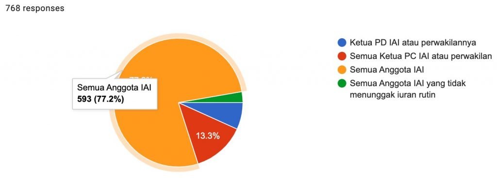 Sebanyak 593 (77.2%) responden memilih semua anggota IAI, disusul 102 (13.3%) responden memilih semua ketua PC IAI atau perwakilannya, dan 52 (6.8%) responden memilih Ketua PD IAI atau perwakilannya.