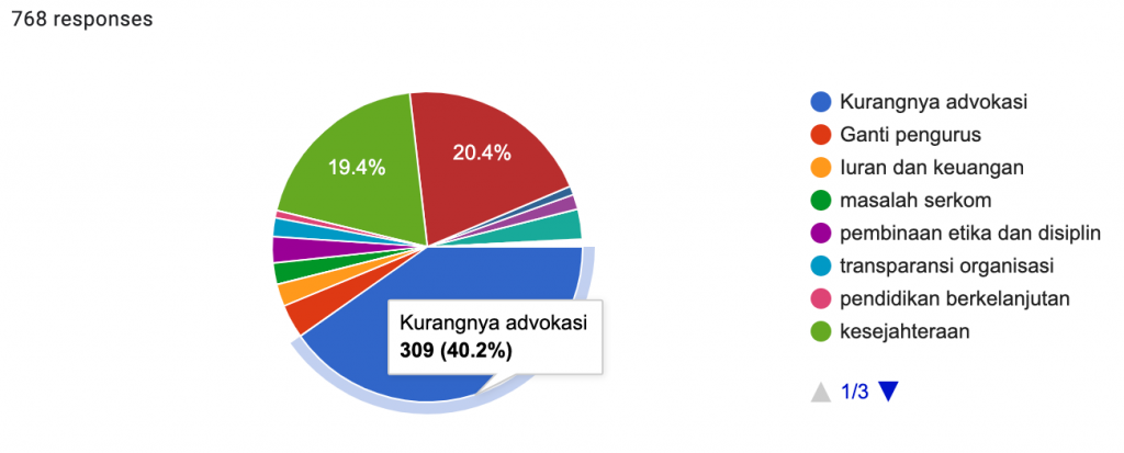 Hasil menunjukkan 309 (40.2 %) responden memilih Kurangnya Advokasi, disusul 157 (20.4%) responden memilih Ganti Pengurus, dan 149 (19.4%) responden memilih kesejahteraan.