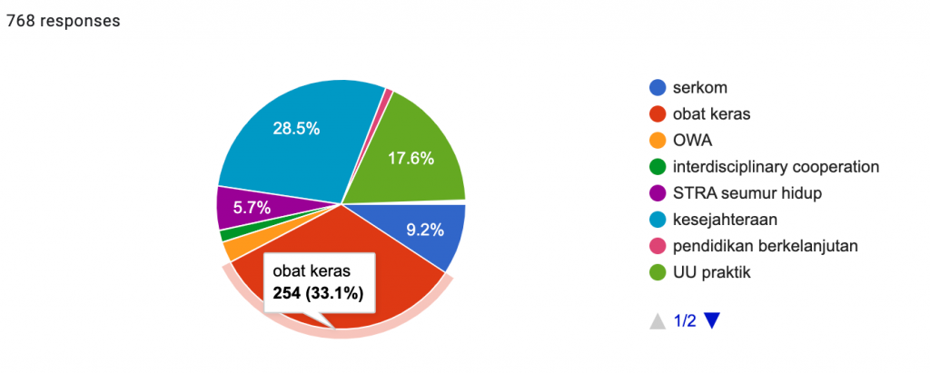 Hasil sementara menunjukkan 254 (33.1 %) responden memilih terkait Obat Keras, 219 (28.5%) responden memilih kesejahteraan, dan 135 (17.6 %) responden memilih UU Praktik.