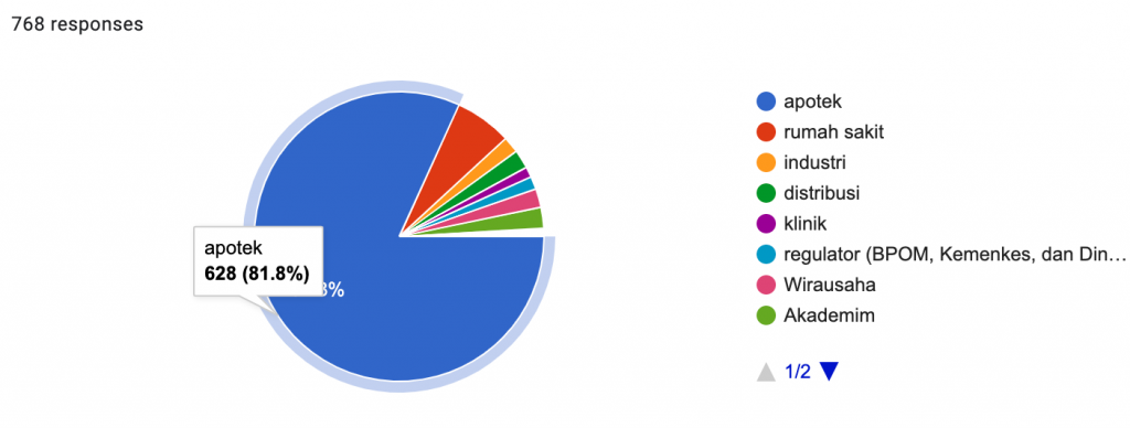 Hasil menunjukkan 628 (81.8%) responden berasal dari Apotek, disusul 49 (6.4%) responden dari Rumah Sakit, dan 18 (2.3%) responden dari akademisi.